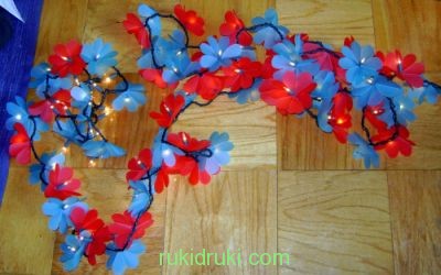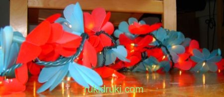 Как украшение для лампочек предлагаемм сделать цветочки. Их можно смастерить из бумаги или ткани.Из бумаги, конечно, проще.Имете ввиду, что при длительном использовании гирлянды нужно время от времени проверять, не греется ли она.
